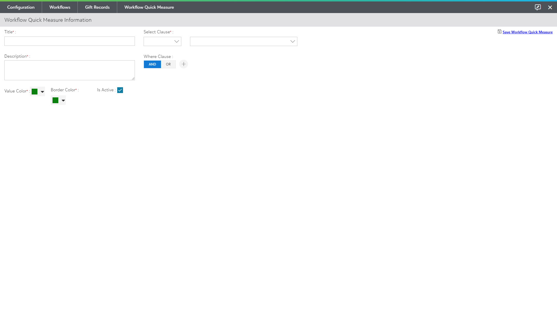 - Title: Enter the text to be displayed as the name of the Quick Measure above the list toolbar of the Workflow item list.