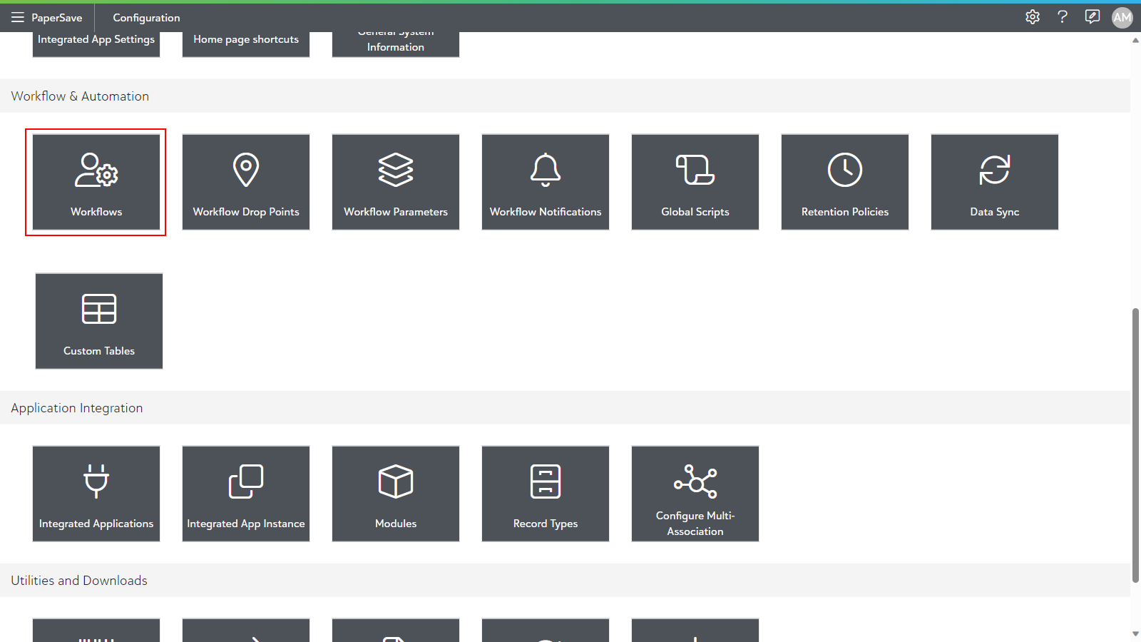 - In the Configuration Area, access Workflows module by scrolling down to Workflow & Automation section as shown in the below screenshot.