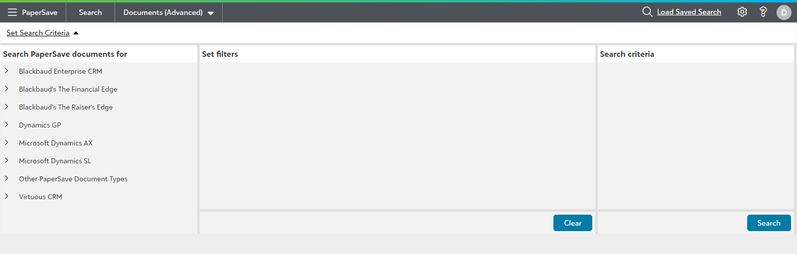 When you select Documents(Advanced) from the Search drop down in the Application bar, the “Set Search Criteria” Panel will be expand where you can select a context and add filters to create your query to narrow down the search for the PaperSave document(s).
