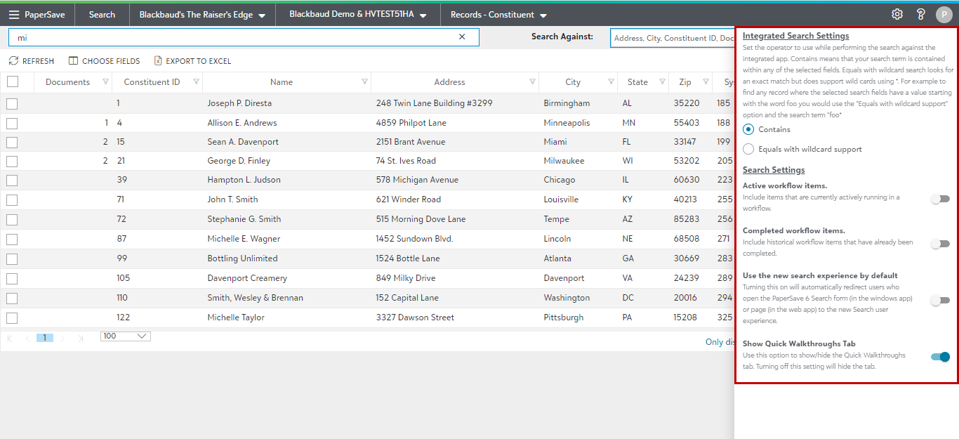 Note: The options you select in the Settings Panel will be available for all search types. Hence, any changes made when in any search area will be reflected globally for the current user.