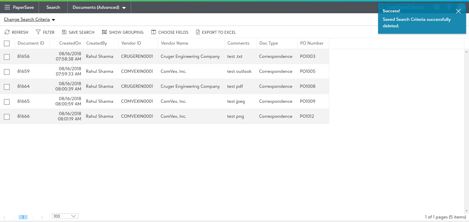 1) To remove the unwanted saved search criteria, you can click on the “Delete Saved Search” from the list toolbar. This option will be shown in the list toolbar after you have loaded a saved search.