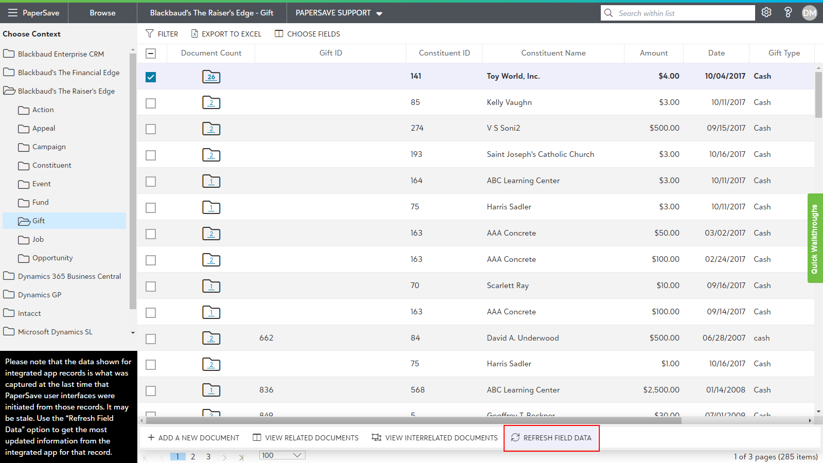 The Integrated record list shows the record field values captured at the time of associating PaperSave document to an integrated application record. Now, it is possible that the record field values have changed later directly from the Integrated application. In such cases, you will require the most updated values for these record fields.