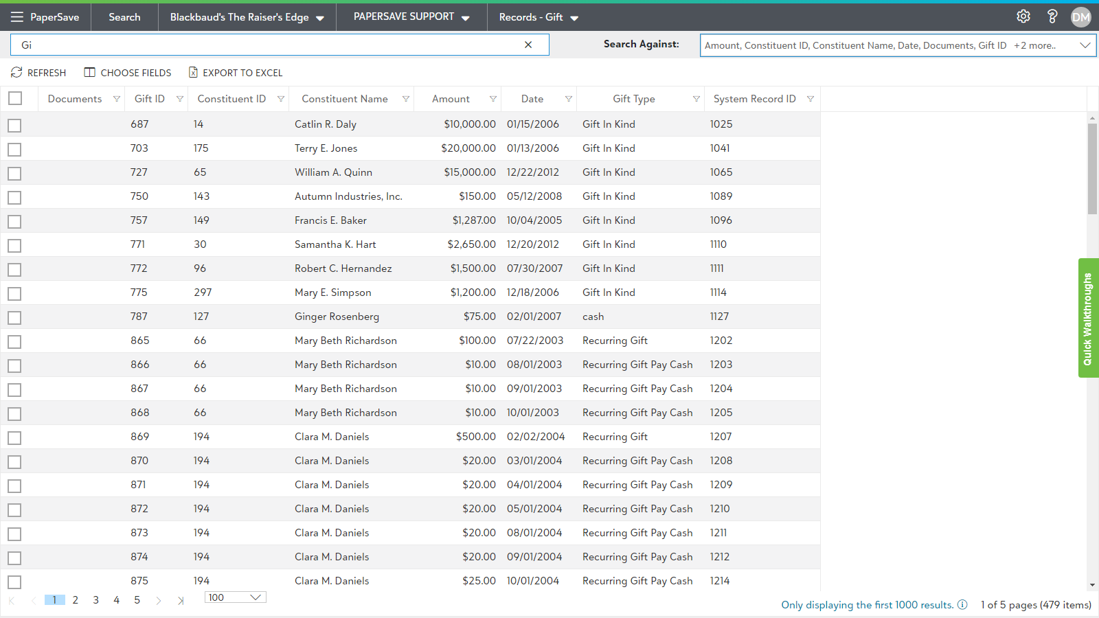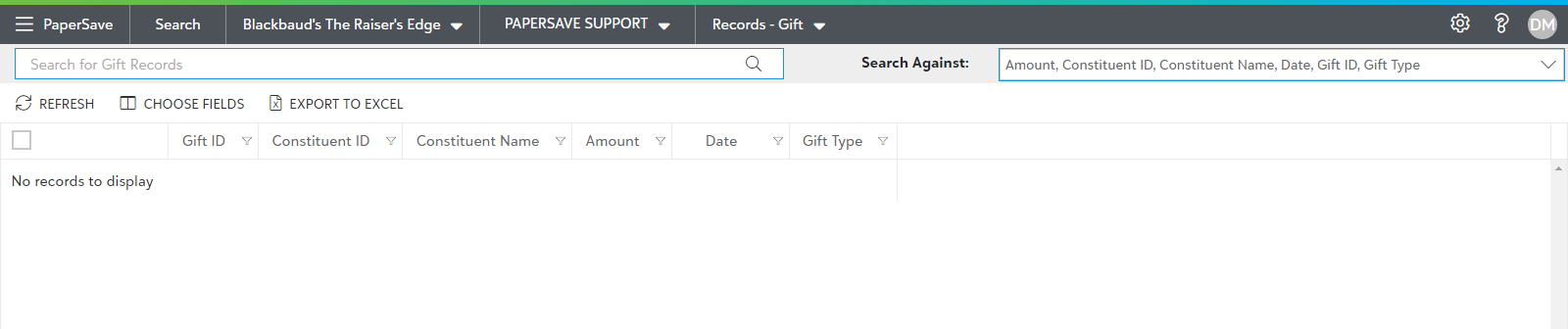 2) Enter the keywords to search documents for the desired record type in Raiser's Edge . Then, press Enter on the keyboard or click on the search icon