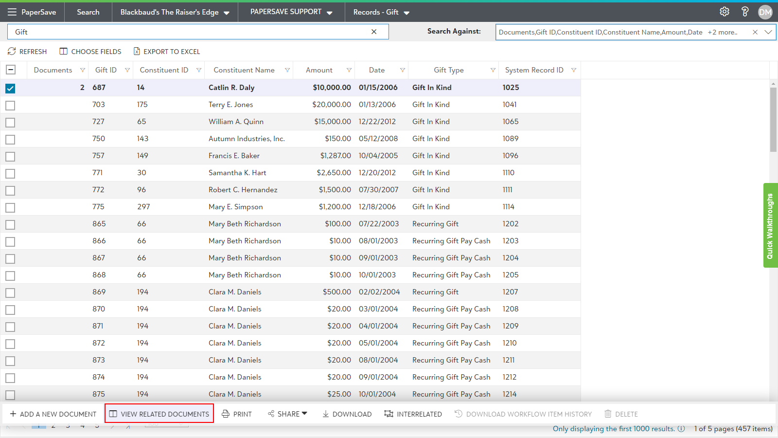 You can view the documents that are associated to any particular record in an integrated application that PaperSave is integrated into. Follow the below steps to view the related documents to an Raiser's Edge record: