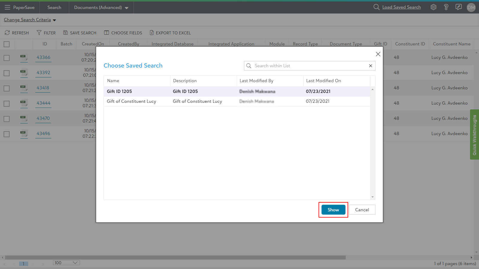 - As you click on “Load Saved Search”, a dialog box containing a list of all the saved search queries will pop-up. Select a search from the list and click on the “Show” button to view the current results.