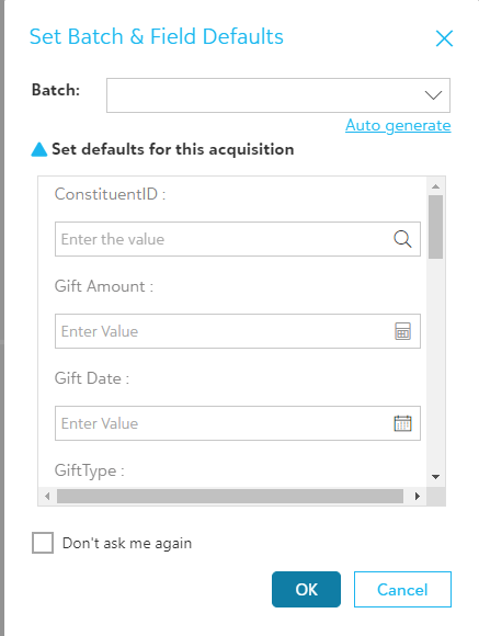 You can turn off the batch prompt by checking off “Don’t ask me again” and clicking on "OK". Your preference will be saved for subsequent acquisitions. You will no longer be prompted to add a batch or set default values for fields for items as they are acquired.