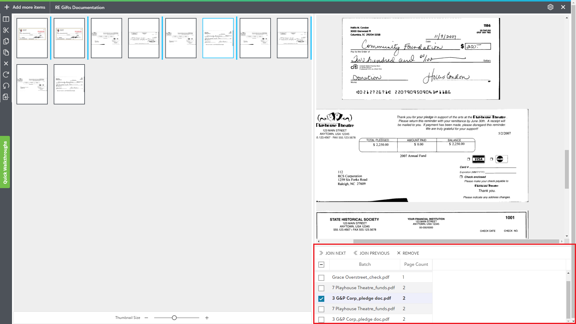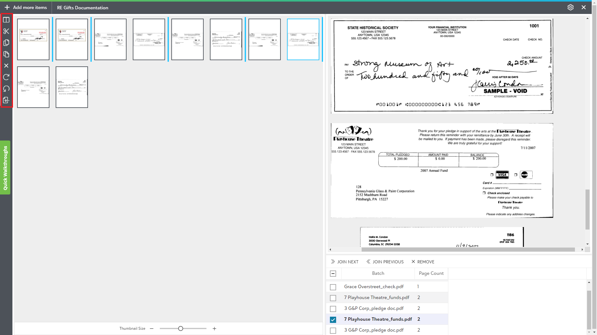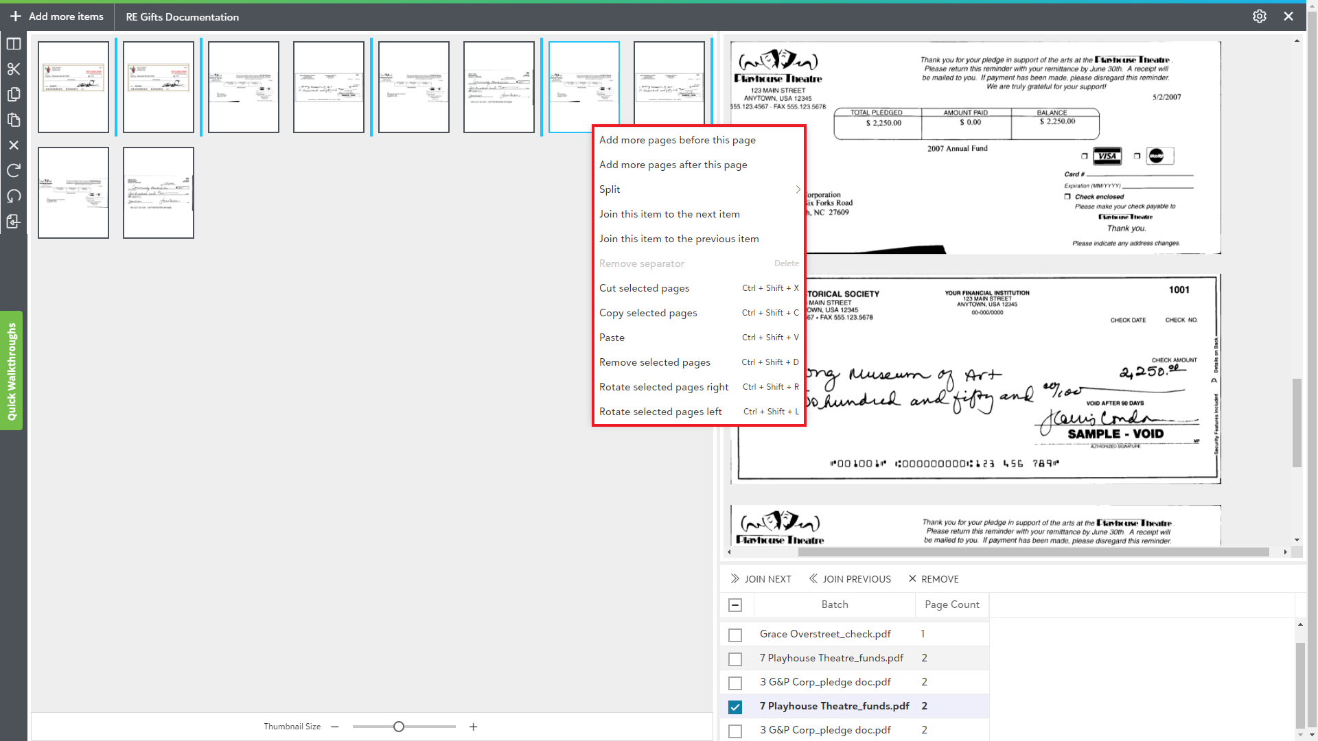 This area offers a thumbnail view for all the unsubmitted items in the Page manipulation view. You can perform various operations on the thumbnails like split pages, cut or copy selected pages, paste those pages, remove unnecessary pages and rotate selected pages.