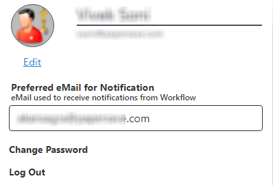 option from the top right corner in the Application toolbar to edit the current user details such as profile picture and preferred Email for Notification as shown in below screen.