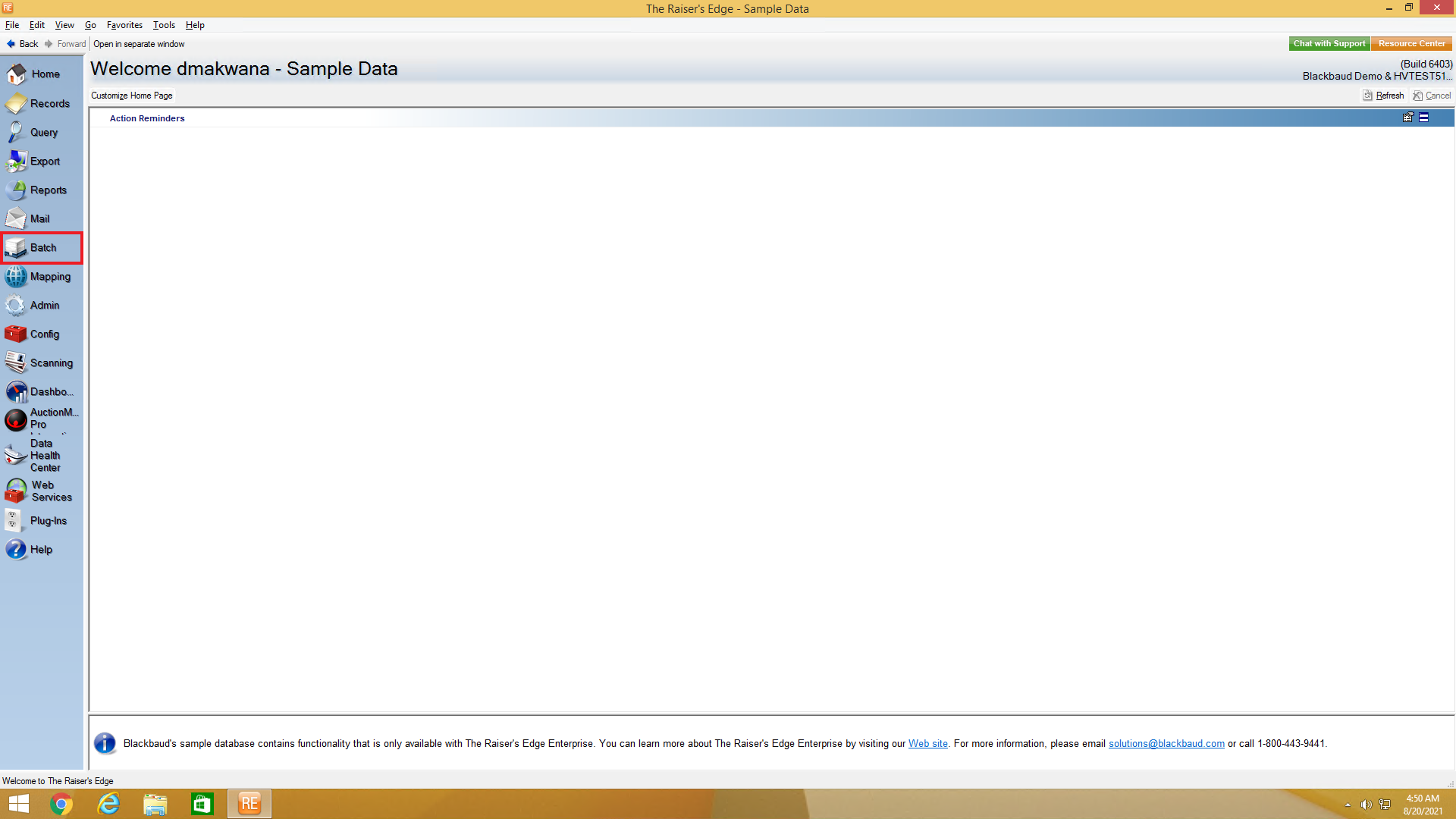 1) Login to Raiser’s Edge and click on Batch in the Raiser’s Edge bar on the left side of the screen, as shown below.