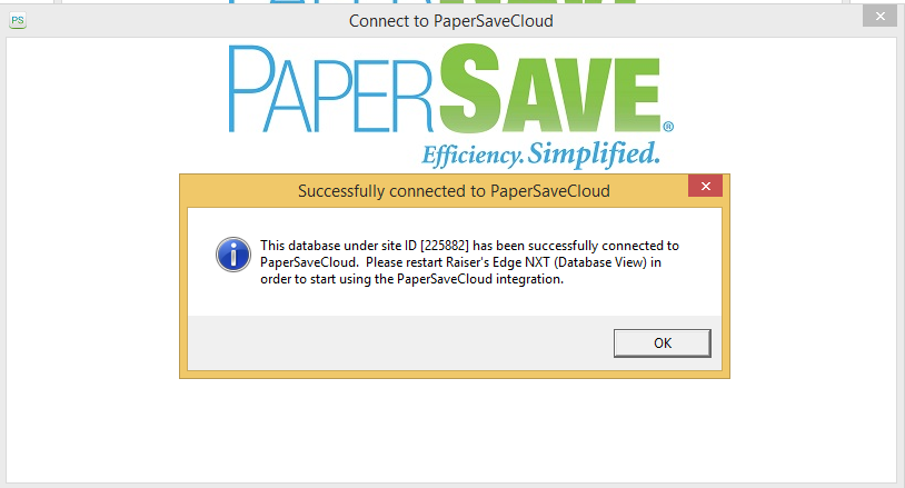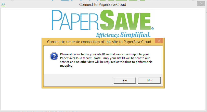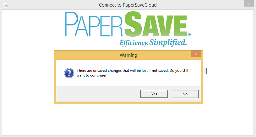 This warning occurs when you exit the “Connect to PaperSaveCloud” dialog box without saving the entered PaperSave Application System site URL .