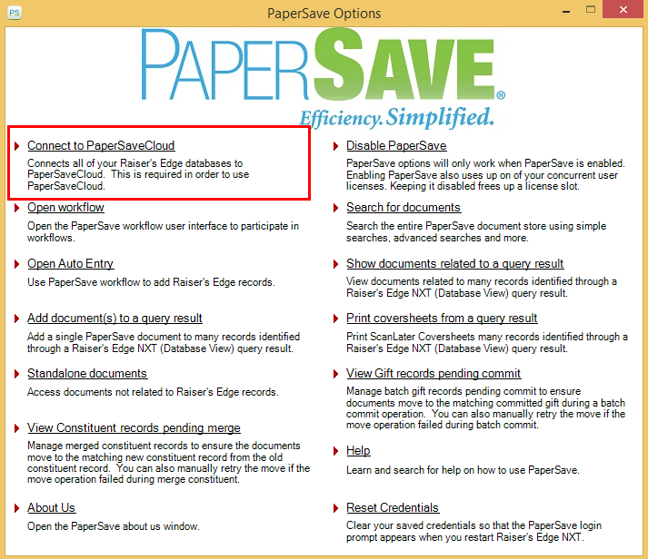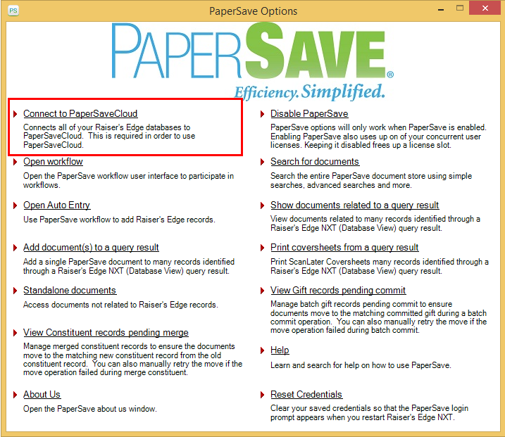 4) Click on the Connect to PaperSaveCloud option from the PaperSave Options window.
