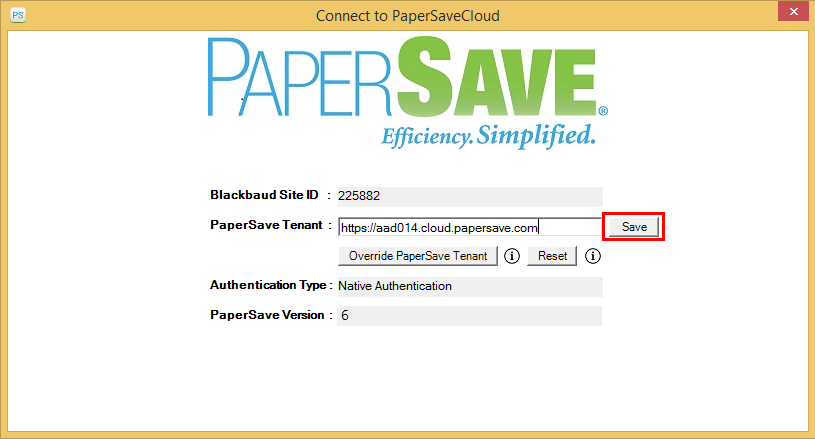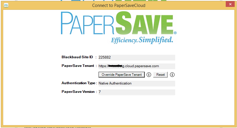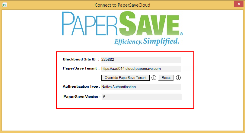 5) Now, the “Connect to PaperSaveCloud” dialog box will appear where you can see the details such as Blackbaud Site ID, PaperSave Tenant, Authentication Type, and PaperSave Version in a read-only mode.