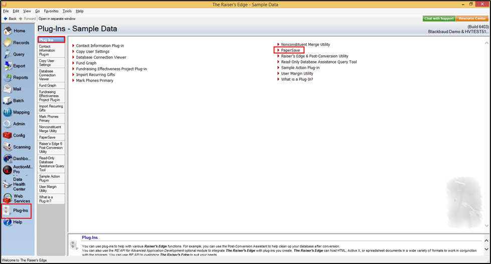 2) Click on the Plug-Ins option from The Raiser’s Edge bar and select PaperSave as shown in the below screen.
