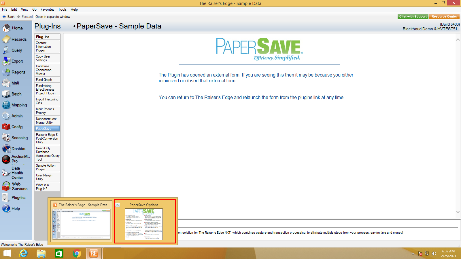 3) Once you click on PaperSave, it opens the PaperSave Options window, which gets automatically minimized. You can hover on the Raiser Edge application icon on the taskbar and select “PaperSave Options” to maximize the window, as shown in the below screen.