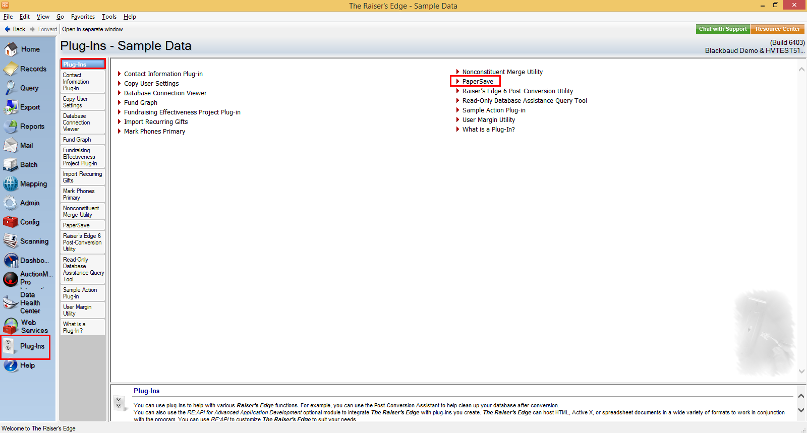 2) Click on the Plug-Ins option in Raiser’s Edge bar and select PaperSave as shown in the below screen.