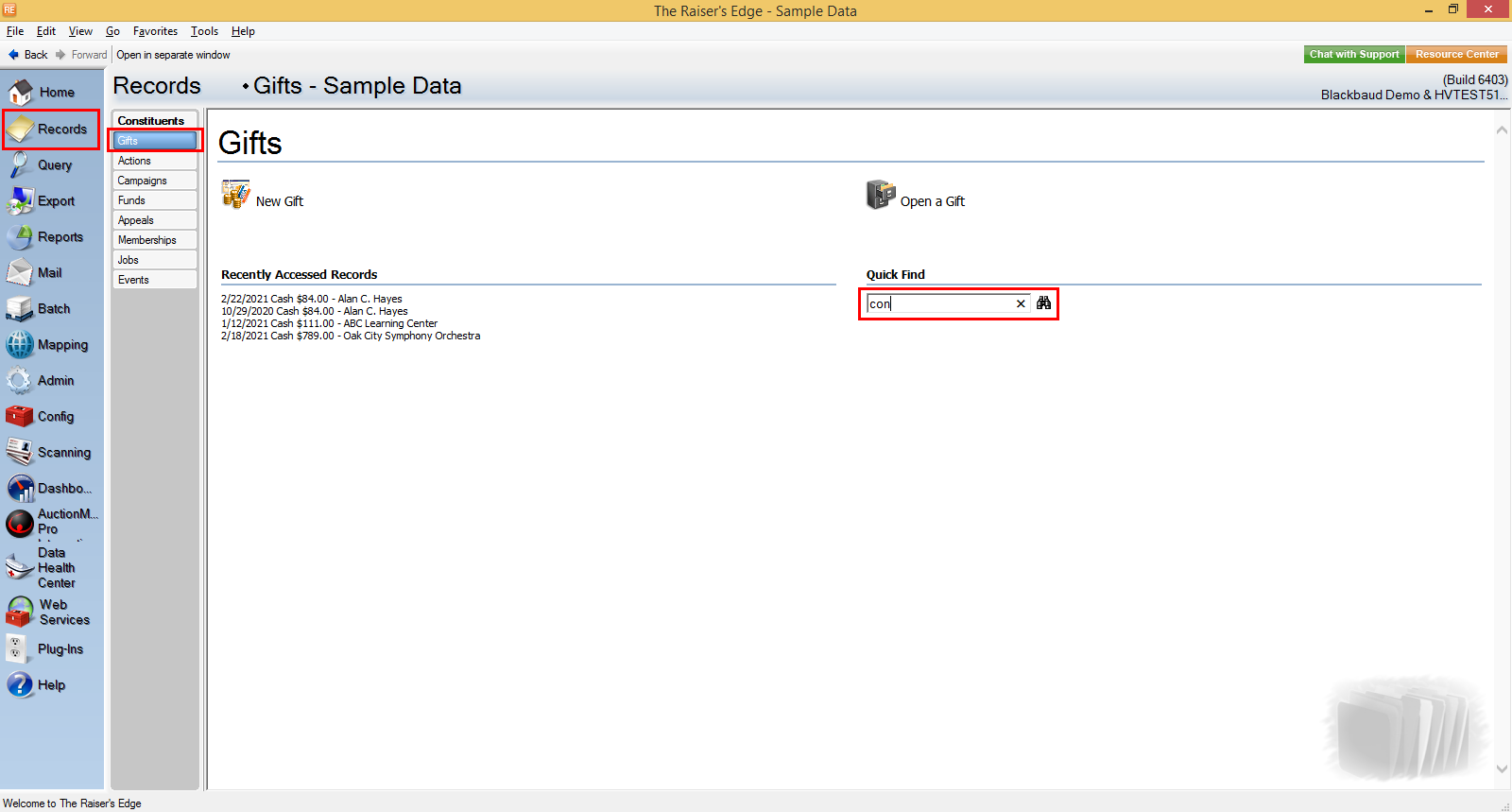 8) Now, go to Records in Raiser’s Edge bar, select Gifts, and enter the committed gift's constituent name in the Quick Find option.