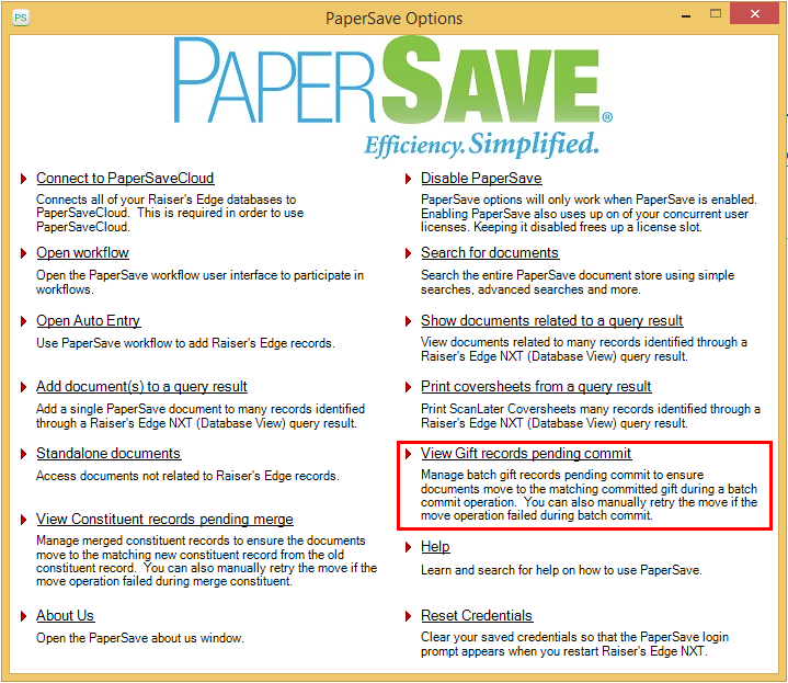 The "View Gift records pending commit" feature allows you to associate such PaperSave documents with Gift records in Raiser’s Edge, which were not associated when the batch was committed.
