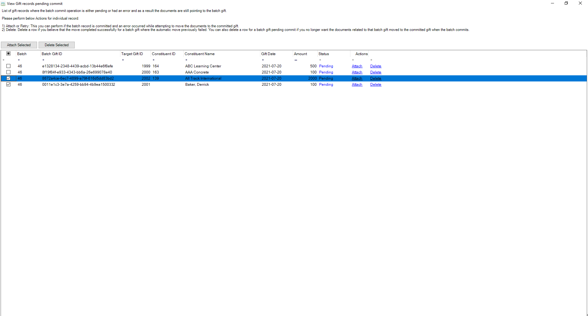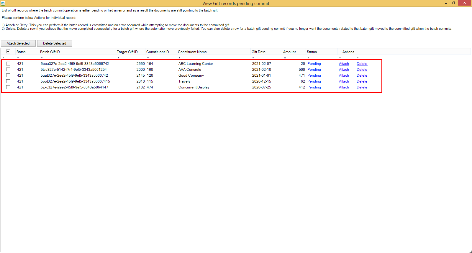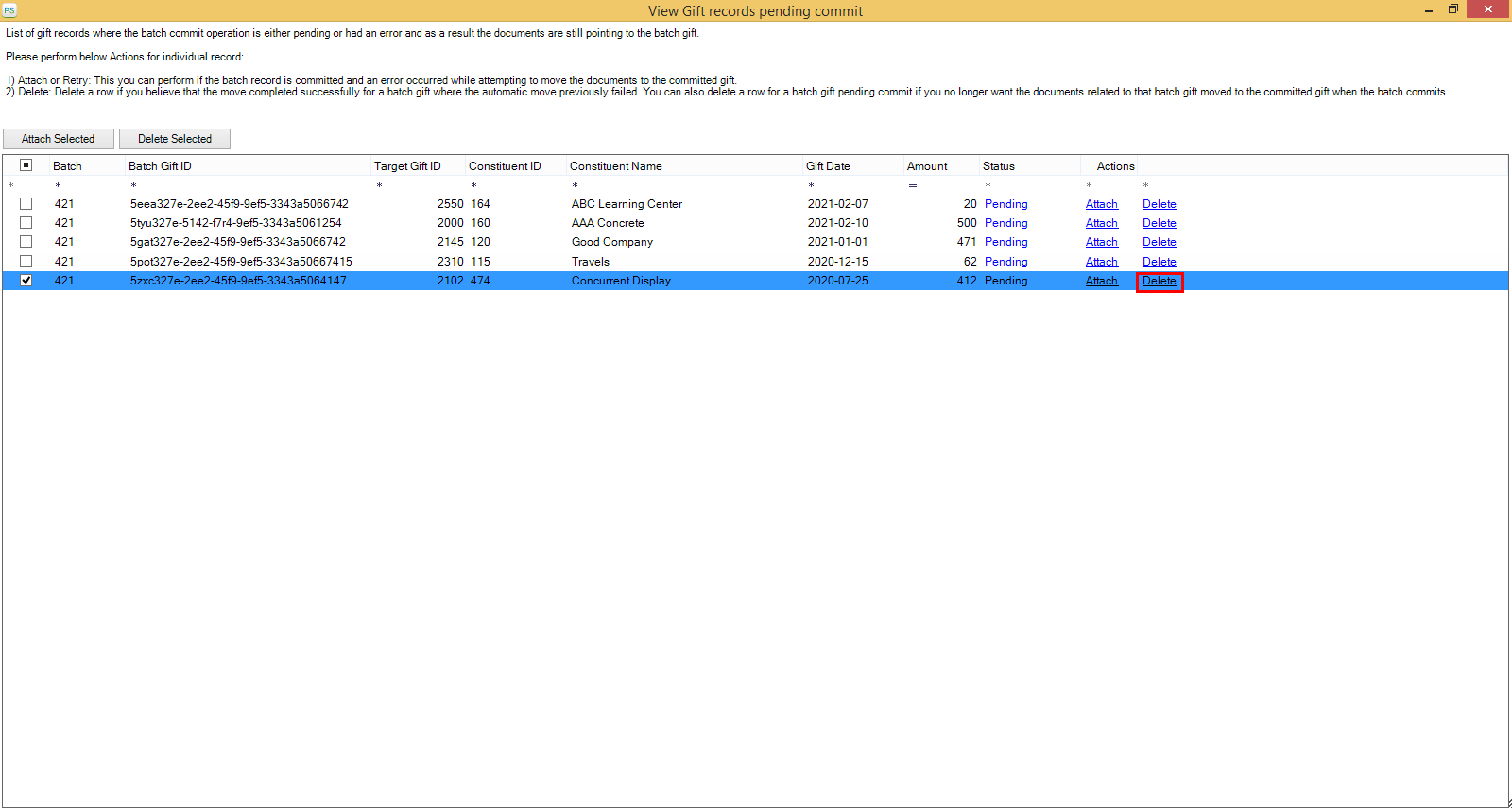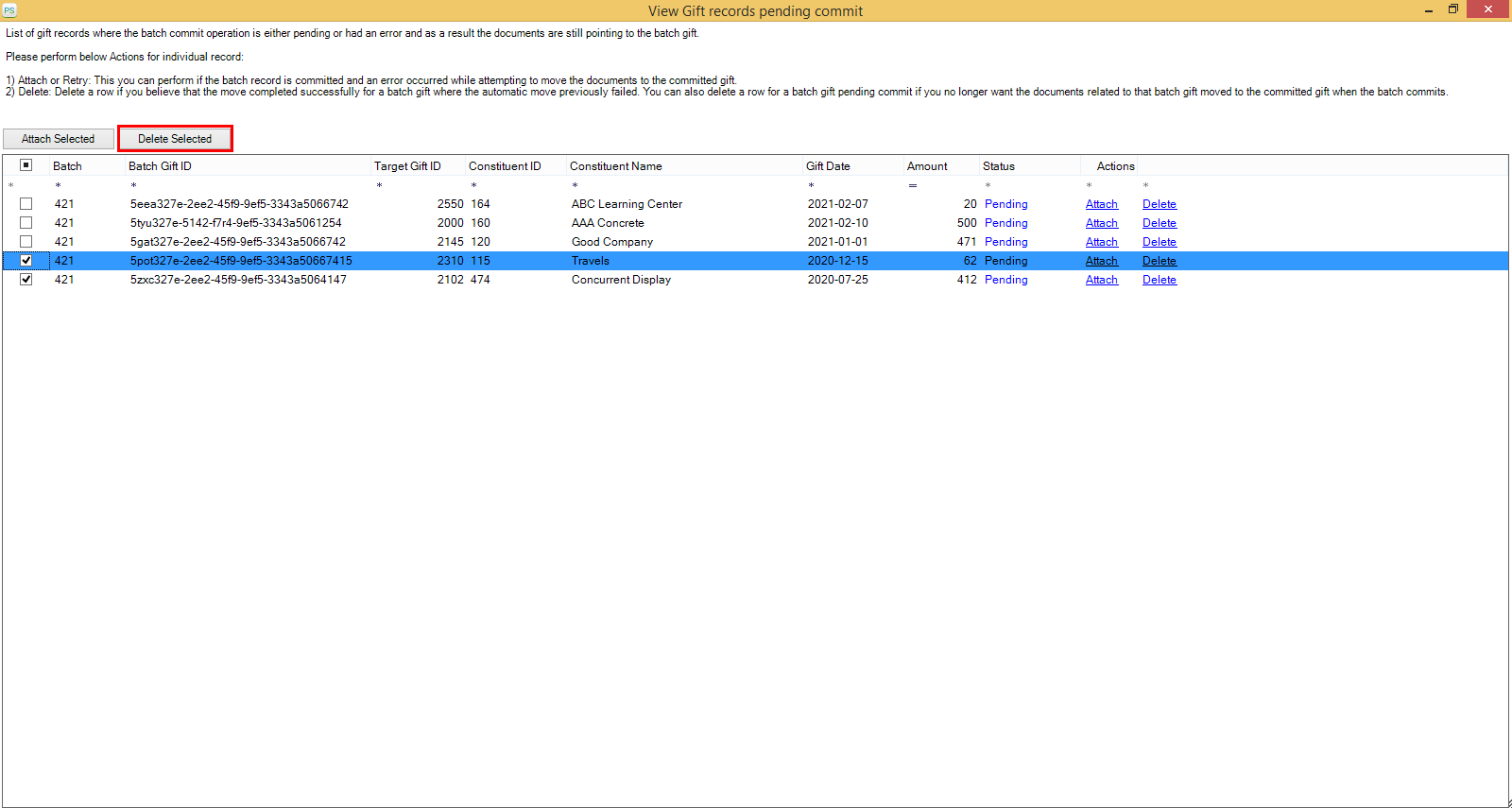 • To delete multiple batch gift records from the list, you can select one or more records using the checkboxes and click on the Delete Selected button as shown in the below screen.