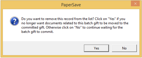 Batch gift records will move within the View Gift records pending commit option when an unexpected error occurs while moving the PaperSave document(s) to the target committed gift record or when your PaperSave is disabled within the PaperSave Options window during a batch commit operation