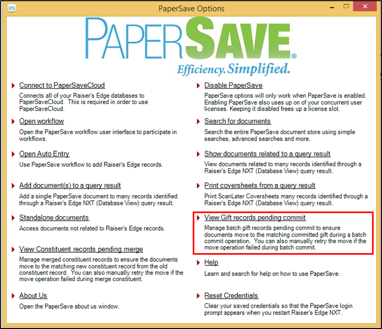 3) Click on the View Gift records pending commit option from the PaperSave Options window.