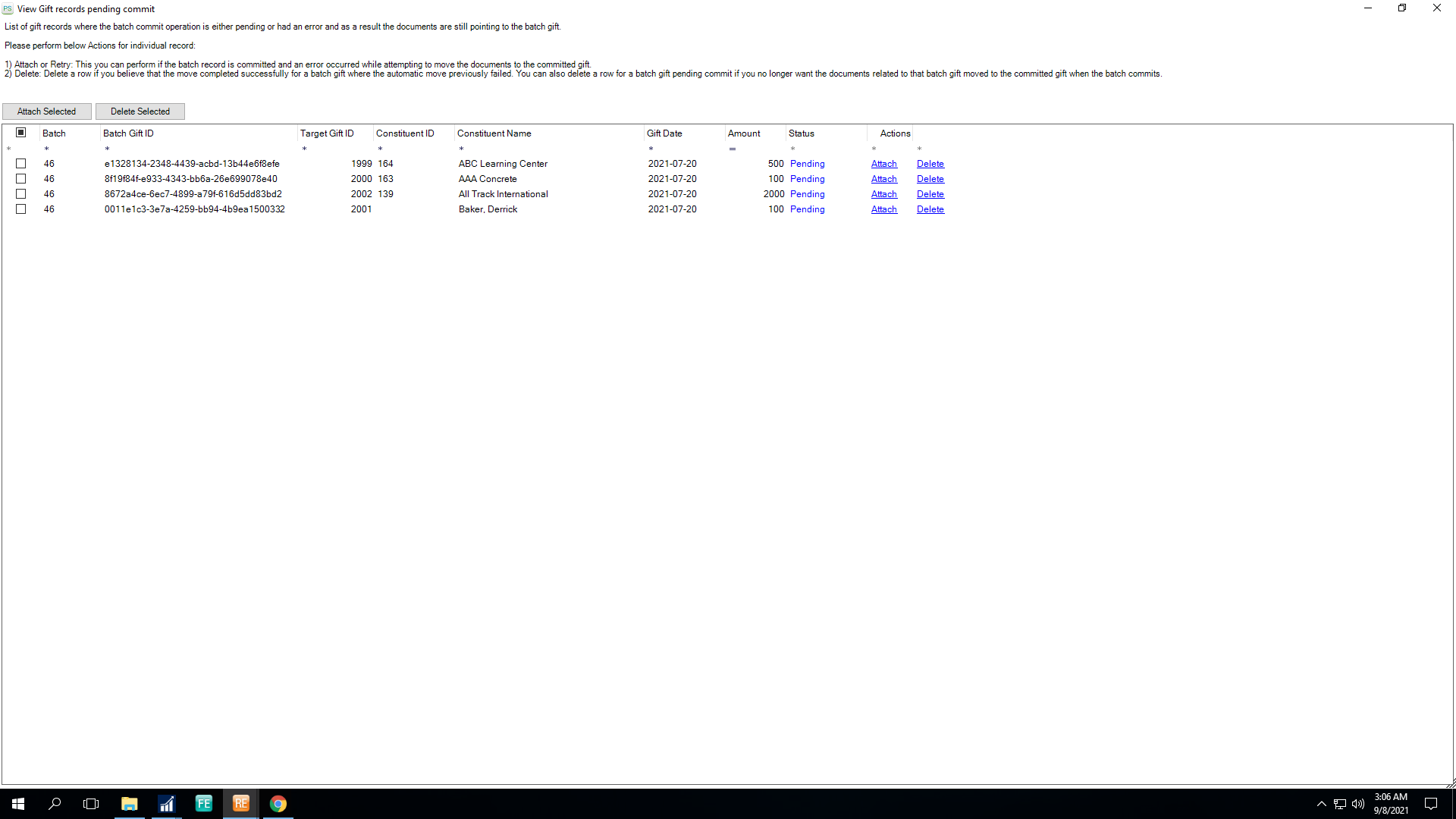 5) Now, you will see a list of the batch records whose batches were committed successfully in Raiser’s Edge, but the PaperSave document(s) were not moved to the committed gift record.
