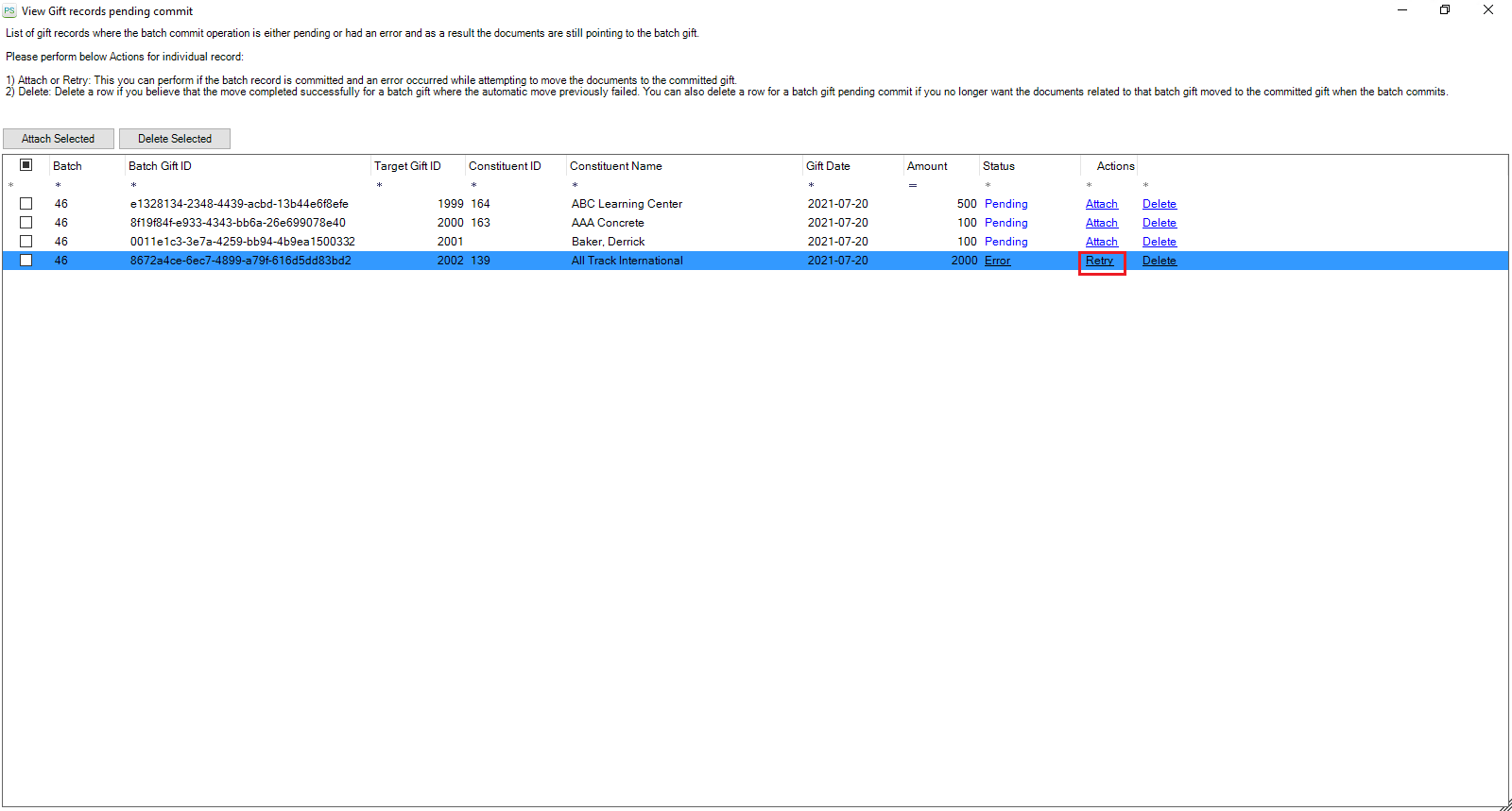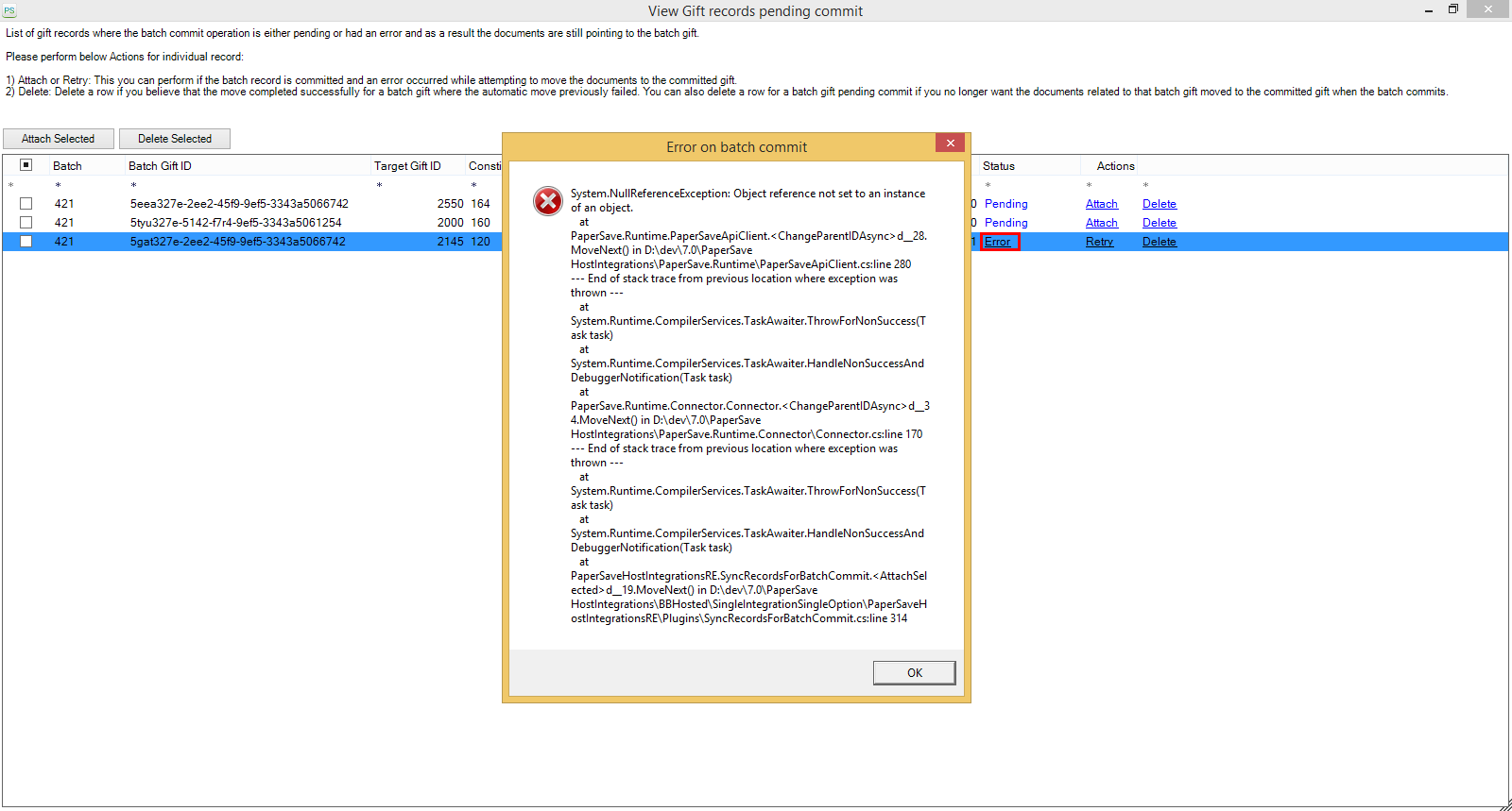 • If you get an unexpected error while attaching the PaperSave document(s), you will see the Action column's Retry link as shown in the below screen. You can click on the Retry to attach the PaperSave document to the committed gift record.