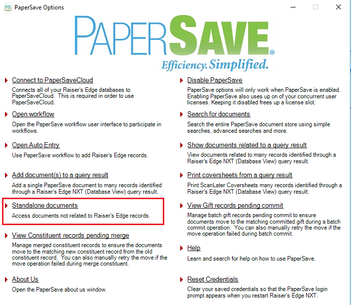 This option allows you to add or view the documents that are not related to Raiser's Edge. Such documents are added within the PaperSave Standalone document type.