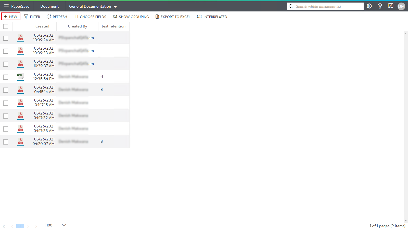 4) You can change the document type from the application bar (for example, General Documentation) and click on +New from the list toolbar to insert the document within the selected document type.