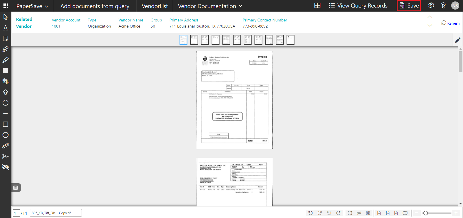 4) Once you have acquired the documents using any of the acquisition method, you will be redirected to the item viewer where you can enter the required values in the profile fields and apply annotations as needed before clicking on Save option from the top-level toolbar to add the document to the selected record.