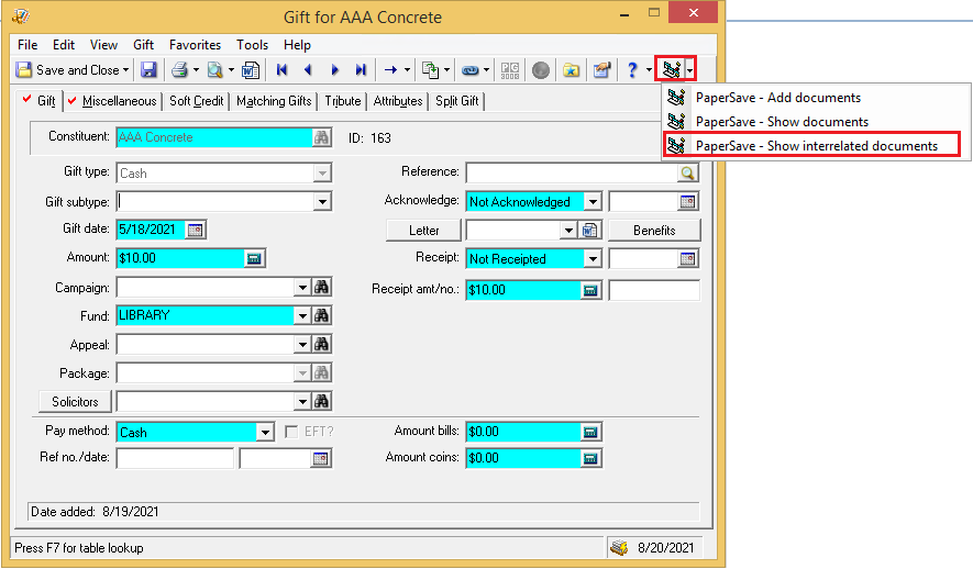 1) In Raiser's Edge, Click on PaperSave - Show interrelated documents from Record as shown in the below screen.