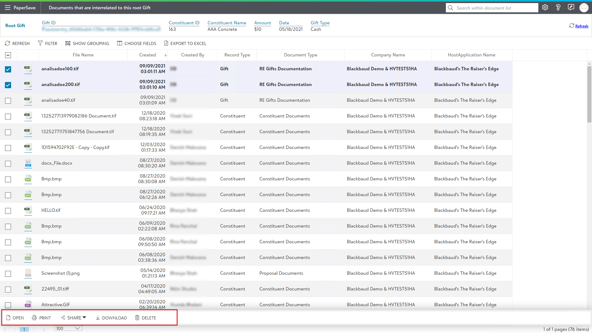 2) Now, it will open interrelated document list window of PaperSave application. If there are multiple documents interrelated with the Raiser's Edge record, then PaperSave document list as shown in the below screen.